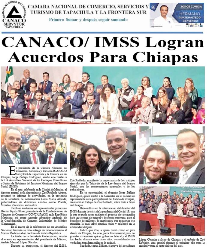 El presidente de la Cámara Nacional de Comercio, Servicios y Turismo (CANACO ServyTur) de Tapachula y la frontera sur de Chiapas, Jorge Zúñiga Rodríguez, asistió este martes a la 114 Asamblea Nacional de los Consejos Consultivos y Juntas de Gobierno del Instituto Mexicano del Seguro Social (IMSS).