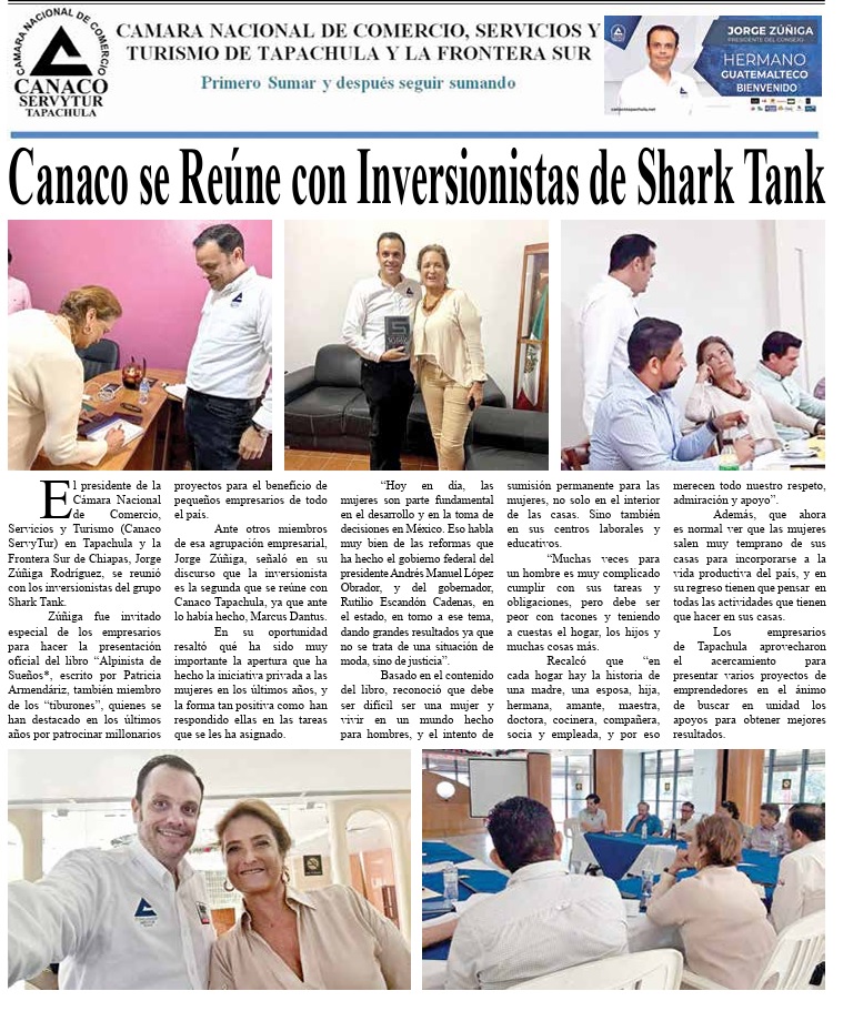 El presidente de la Cámara Nacional de Comercio, Servicios y Turismo (Canaco ServyTur) en Tapachula y la Frontera Sur de Chiapas, Jorge Zúñiga Rodríguez, se reunió con los inversionistas del grupo Shark Tank.