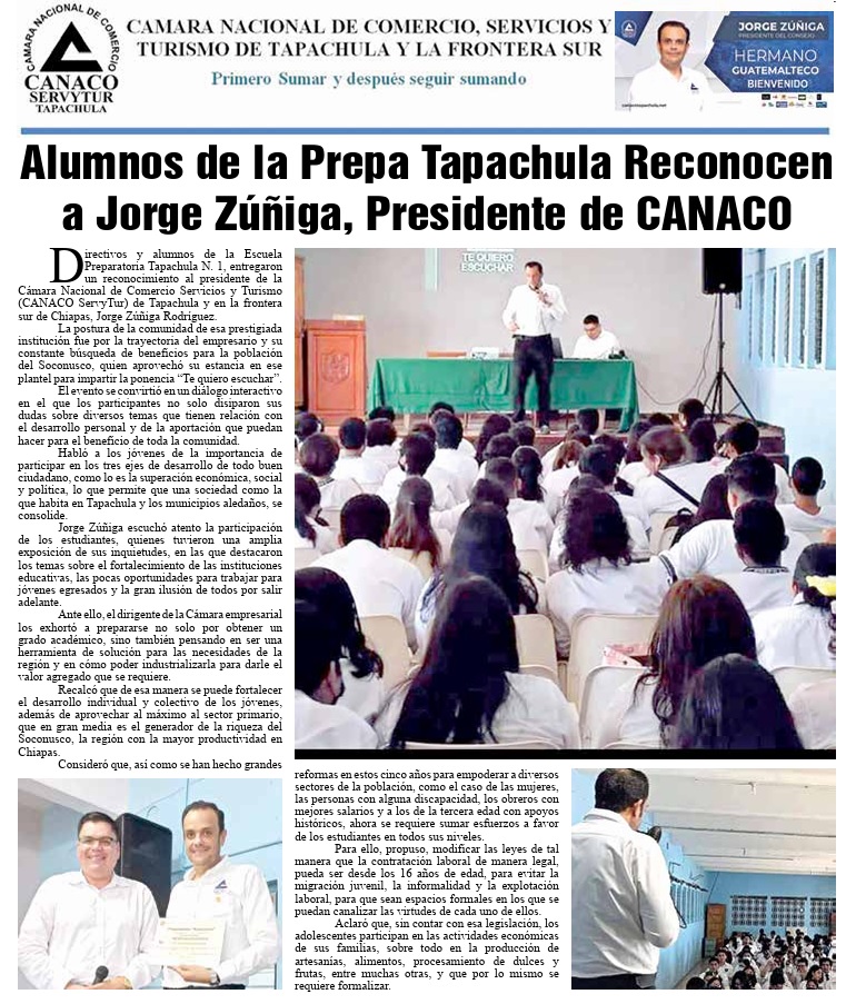 Directivos y alumnos de la Escuela Preparatoria Tapachula N. 1, entregaron un reconocimiento al presidente de la Cámara Nacional de Comercio Servicios y Turismo (CANACO ServyTur) de Tapachula y en la frontera