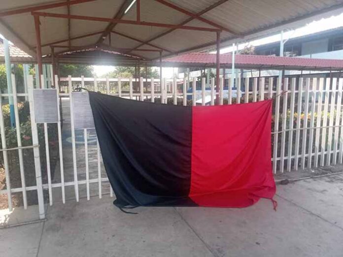 Los inconformes colocarán en la entrada principal de la institución educativa la bandera rojo y negro, en señal de suspensión de actividades. Así como una comisión de estudiantes normalistas mantiene cerrado el portón principal del plantel.