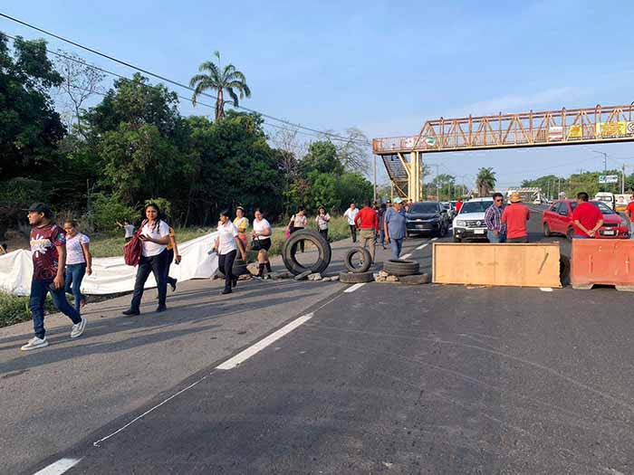 Tapachula, Chiapas; 8 de Mayo del 2024.- Habitantes de la colonia Feliciano Renaud, bloquearon desde la mañana de este miércoles la carretera Tapachula-Puerto Madero para exigir la construcción de un tope peatonal, así como la reparación de un puente peatonal, el cual aseguran se encuentra en malas condiciones.