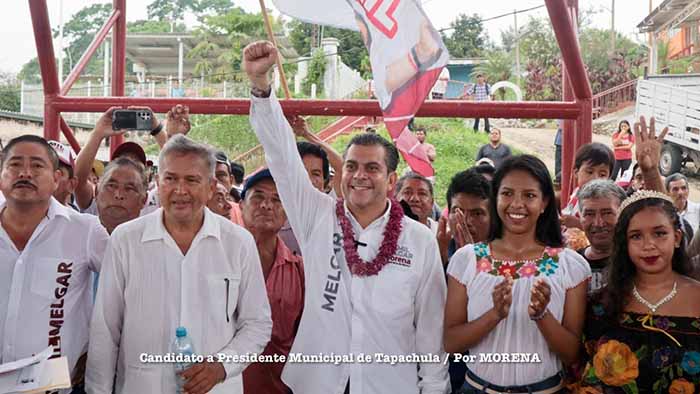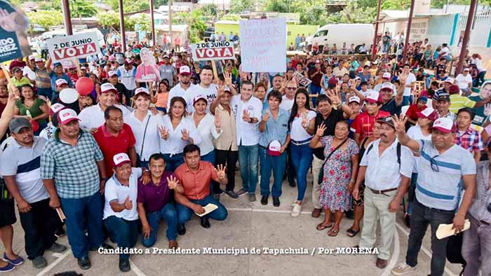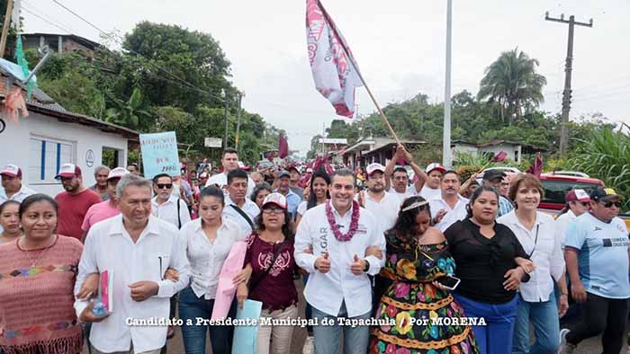 Tapachula Chiapas, 19 Mayo de 2024.- Al unísono de ¡Presidente, presidente! Yamil Melgar, candidato a la presidencia municipal de Tapachula por MORENA, fue recibido por habitantes de las comunidades de la Zona Media Alta de Tapachula.