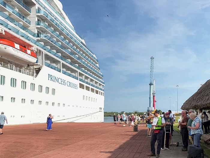 Tapachula, Chiapas.- Autoridades de los tres niveles de Gobierno dieron la bienvenida al crucero Coral Princess de la línea naviera Princess Cruises, que arribó a Puerto Chiapas a las 8:00 de la mañana con 2 mil 816 pasajeros a bordo, procedente de Puntarenas, Costa Rica.