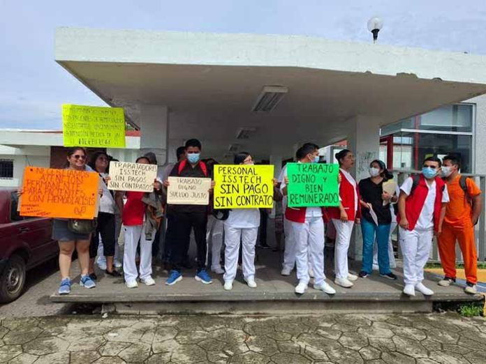 Tapachula, Chiapas; 2 de Junio de 2025.- Personal médico y administrativo del Instituto de Seguridad Social de los Trabajadores del Estado de Chiapas (ISSTECH) en Tapachula inició este lunes una protesta pacífica mediante una huelga de brazos caídos, en exigencia del pago de salarios atrasados y la formalización de contratos laborales.