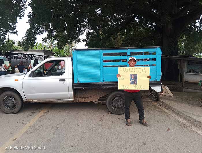 Tapachula, Chiapas; 07 de Julio de 2025.-Unas 40 personas del ejido Álvaro Obregón se manifestaron este lunes en el Parque Central de este ejido, para exigir justicia por el asesinato de José Miguel González Orozco, joven de 20 años asesinado a machetazos el pasado sábado en el barrio Guadalupe.