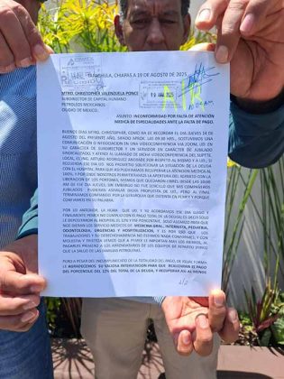 Los manifestantes confían en que el subdirector de PEMEX, maestro Christopher Valenzuela, intervenga para gestionar el pago pendiente al Hospital Santa Fe, lo cual permitiría reanudar los servicios suspendidos. No vamos a silenciarnos. Si alguno debe comparecer, lo hará, pero no dejaremos de exigir lo que por derecho nos corresponde, concluyó. EL ORBE/Nelson Bautista