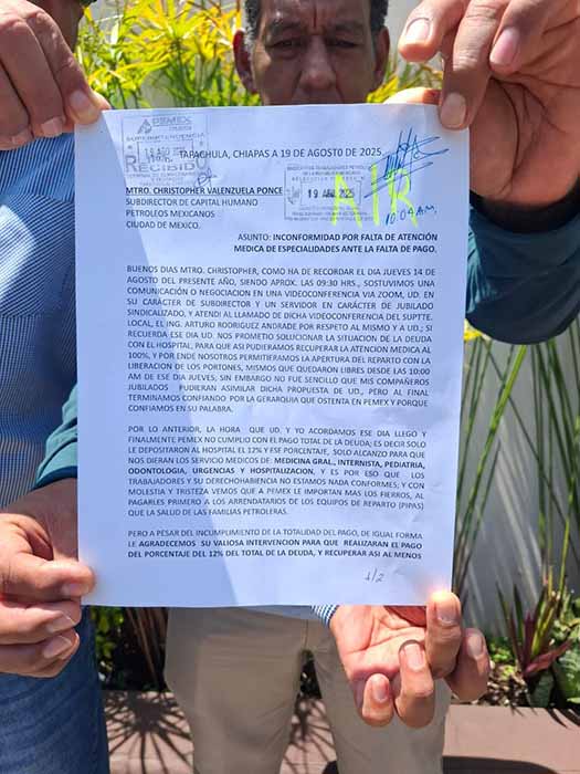 Tapachula, Chiapas; 20 de Agosto de 2025.- Jubilados de Petróleos Mexicanos (PEMEX) denunciaron presuntas represalias legales por parte de la empresa, luego de que se manifestaran pacíficamente en las instalaciones de la Terminal de Almacenamiento y Distribución (TAD) en Puerto Chiapas, en exigencia del restablecimiento total de sus servicios médicos.