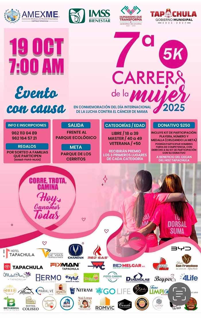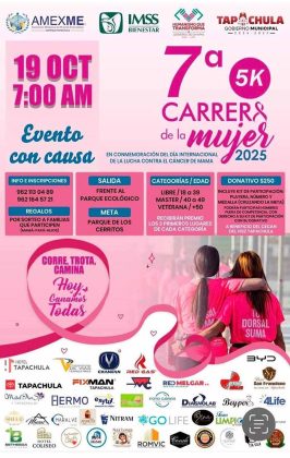 Tapachula, Chiapas; 03 de octubre 2025.- El Ayuntamiento de Tapachula que preside el alcalde Yamil Melgar Bravo, a través de la Secretaría de Juventud y Deporte Municipal, se sumó a la 7a. Carrera de la Mujer 2025 5K a realizarse el próximo 19 de octubre a las 7 de la mañana en el marco del Día Mundial de la Lucha Contra el Cáncer de Mama.