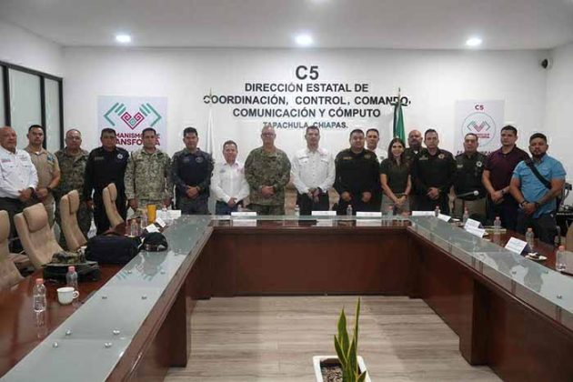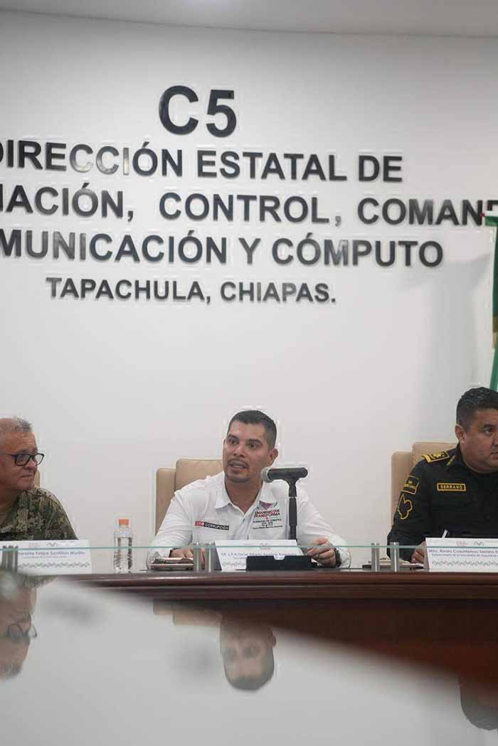 Tapachula, Chiapas; 16 de Octubre de 2025.- Con el firme compromiso de continuar fortaleciendo las acciones en materia de seguridad y garantizar la paz y el bienestar del Estado, el secretario de Seguridad del Pueblo, Óscar Alberto Aparicio Avendaño, junto al comandante de la XXII Zona Naval con sede en Puerto Chiapas, vicealmirante Martín Felipe de Jesús Santillán Murillo; la titular del Instituto Nacional de Migración (INM) en Chiapas, Farah Gertrudis Cerdio Moisés; el fiscal de Distrito Fronterizo – Costa de la Fiscalía General del Estado (FGE), Arturo Pablo Liévano; el subsecretario de Seguridad del Pueblo, Álvaro Serrano Escobedo; el director de la Guardia Estatal Fronteriza, Diego Echavarría Lara; y el secretario de Seguridad Pública Municipal, Manuel Alejandro Lluch García, llevaron a cabo una reunión de trabajo interinstitucional con mandos operativos de los tres niveles de Gobierno.