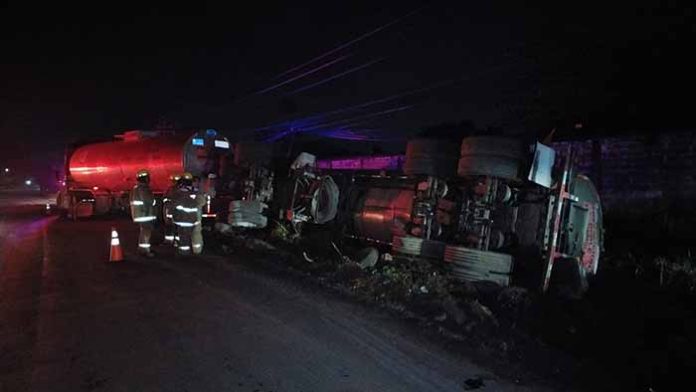 Tapachula, Chiapas; 23 de Octubre.- Un aparatoso accidente vial se registró este jueves, en el Libramiento Sur, a la altura de la entrada de la colonia Octavio Paz, donde un tráiler de doble remolque volcó su segunda pipa, cargada con 30 mil litros de aceite vegetal de palma.