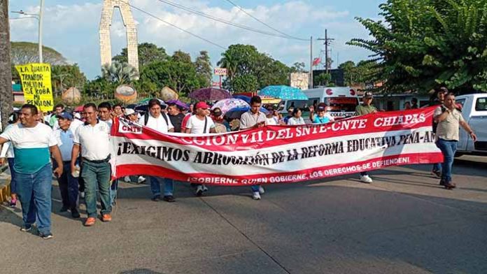 Tapachula, Chiapas; 26 de Enero de 2026.- Integrantes de la Coordinadora Regional Costa Grande, adheridos a la Sección VII del SNTE-CNTE, realizaron este lunes una movilización en la ciudad de Tapachula para exigir al Gobierno Federal el cumplimiento de demandas históricas en materia de pensiones, jubilaciones y servicios de salud, así como justicia por la desaparición de los 43 normalistas de Ayotzinapa.