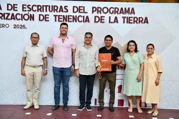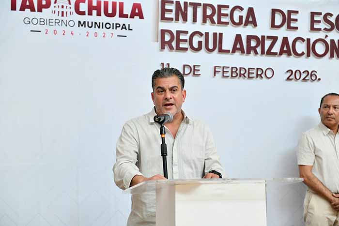 Tapachula, Chiapas, 11 de febrero 2026.- Treinta y dos familias de once colonias de Tapachula, recibieron este día las escrituras de su propiedad con lo que se garantiza certeza jurídica y patrimonial, además de seguridad de un futuro mejor, destacó el presidente municipal, Yamil Melgar Bravo al presidir la entrega como parte del Programa de Regularización de la Tenencia de la Tierra.