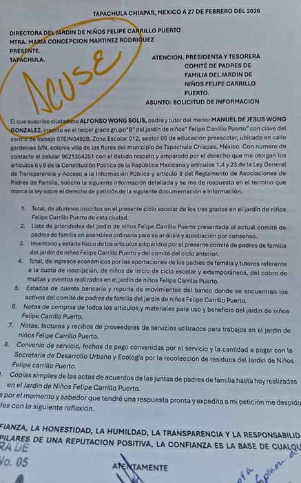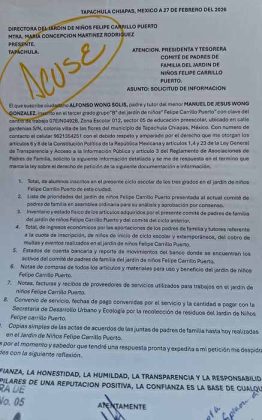 Tapachula, Chiapas; 12 de Marzo de 2026.- Padres de familia del Jardín de Niños Felipe Carrillo Puerto, con clave 07EIN0492B), denunciaron presuntas irregularidades en el manejo de las cuotas escolares y exigieron una revisión detallada de los recursos administrados por el Comité de Padres de Familia y la Dirección del plantel.