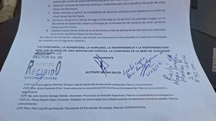 Encabezados por Alfonso Wong Solís, los tutores entregaron un oficio formal a la escuela y a autoridades educativas, en el que solicitan la comprobación física y documental de los gastos realizados durante el presente ciclo escolar.