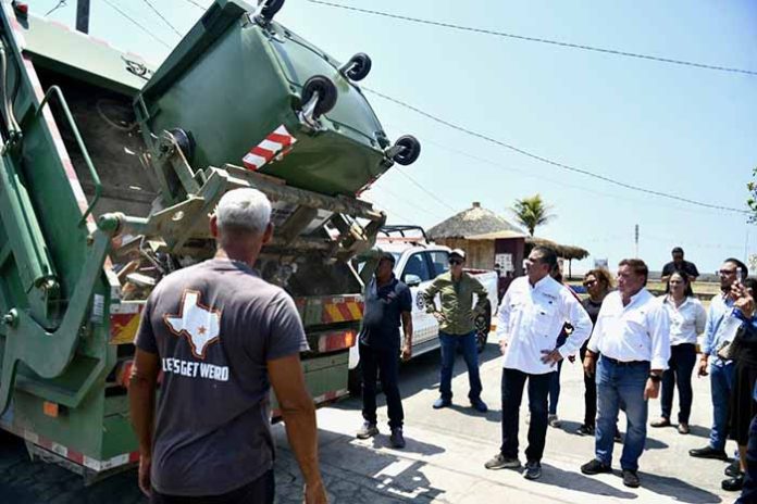Puerto Madero, Tapachula, Chiapas; 29 de marzo de 2026.- En gira de trabajo por Puerto Madero, el presidente municipal, Yamil Melgar, supervisó personalmente la correcta operación del servicio de recolección de residuos sólidos, verificando que los camiones trabajen de manera oportuna, eficiente y sin fallas.