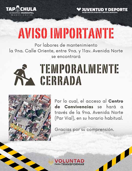 El Ayuntamiento de Tapachula a través de la Secretaría de Obras Públicas informa a la ciudadanía n general que debido a trabajos de mantenimiento la 9a. calle Oriente entre 9a. y 11a. avenida Norte, PERMANECERÁ CERRADA TEMPORALMENTE.