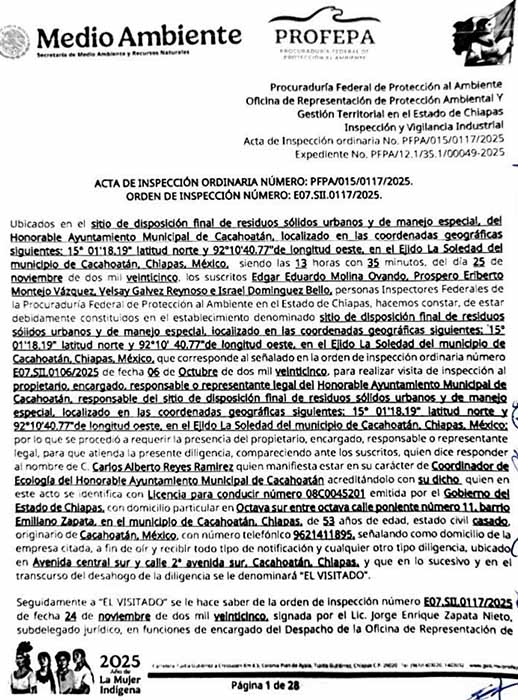 Cacahoatán, Chiapas; 23 de Abril de 2026.- El aún presidente municipal de Cacahoatán, Víctor Pérez Saldaña, continúa ignorando las recomendaciones emitidas por la Procuraduría Federal de Protección al Ambiente (PROFEPA), como consta en el acta de inspección ordinaria No. PFPA/015/0117/2025 y en el expediente No. PFPA/12.1/35.1/00049-2025, entregados a las autoridades locales desde el año pasado. Dichas observaciones derivaron incluso en la clausura del sitio, misma que ha sido sistemáticamente desacatada.