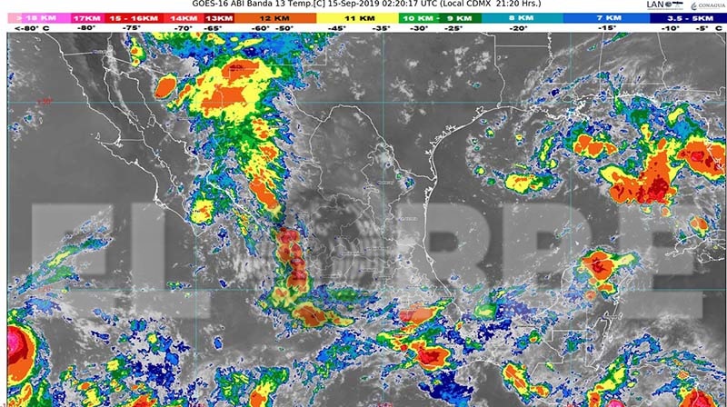 Ciudad de México; 14 de septiembre.- Se prevén lluvias intensas para Veracruz, Oaxaca y Chiapas; muy fuertes para Chihuahua, Durango, Nayarit, Jalisco, Colima, Michoacán, Guerrero, Morelos, Puebla, Tabasco, Campeche y Yucatán; fuertes para Baja California Sur, Sonora, Sinaloa, San Luis Potosí, Guanajuato, Querétaro, Hidalgo, Tlaxcala, Estado de México, Ciudad de México y Quintana Roo; intervalos de chubascos para Nuevo León y Tamaulipas, y lluvias aisladas para Coahuila, Zacatecas y Aguascalientes.