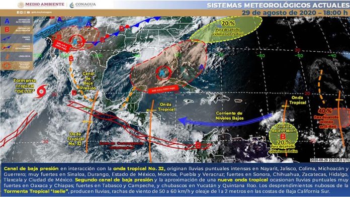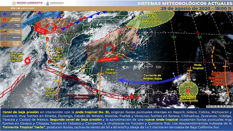Dichas condiciones serán generadas por la Onda Tropical Número 32, que recorrerá el occidente del territorio nacional, en combinación con abundante entrada de humedad del Océano Pacífico; por un canal de baja presión sobre el norte y centro del país que interaccionará con inestabilidad en niveles altos de la atmósfera, y por la nueva Onda Tropical Número 33, que recorrerá el sureste de México.