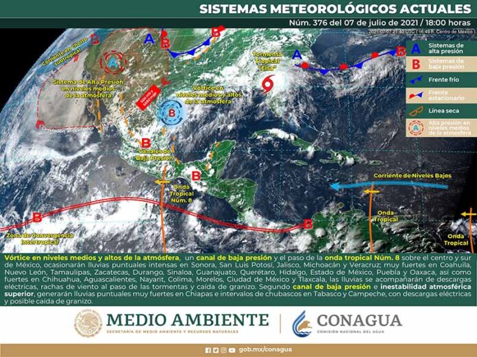 México.- Durante esta noche y madrugada, un vórtice en niveles medios y altos de la atmósfera, sobre el noreste de México, en interacción con un canal de baja presión extendido a lo largo de la Sierra Madre Occidental y con el paso de la Onda Tropical Número 8 por el centro y sur del territorio nacional, ocasionará nublados densos y lluvias intensas (de 75.1 a 150 milímetros [mm]) en Jalisco, Michoacán, San Luis Potosí, Sonora y Veracruz; muy fuertes (de 50.1 a 75 mm) en Coahuila, Durango, Estado de México, Guanajuato, Hidalgo, Nuevo León, Oaxaca, Puebla, Querétaro, Sinaloa, Tamaulipas y Zacatecas y fuertes (de 25.1 a 50 mm) en Aguascalientes, Chihuahua, Ciudad de México, Colima, Morelos, Nayarit y Tlaxcala.