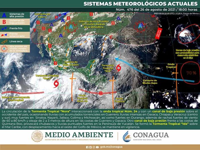 Las condiciones descritas serán generadas por la tormenta tropical Nora, que se localizará al sur de las costas de Colima y Michoacán y absorberá a la onda tropical número 24, así como por la tormenta tropical Ida, situada en el Mar Caribe y el cual se aproximará al Canal de Yucatán y el occidente de Cuba, e interaccionará con un canal de baja presión extendido sobre el Golfo de México y la Sonda de Campeche.