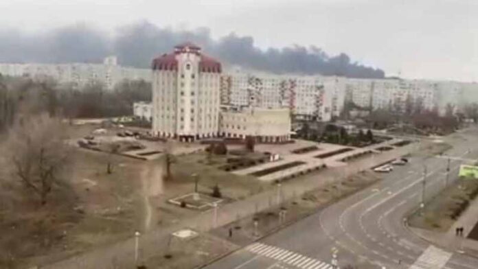 Un video distribuido por el Ministerio del Interior de Ucrania por Telegram la mañana de este jueves (hora de México) mostraba llamas y humo negro saliendo de la ciudad, habitada por unas 50 mil personas.