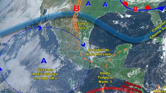 De acuerdo con el Servicio Meteorológico Nacional, a la par habrá sobre el país una línea seca en el norte de México, que combinándose con una corriente de chorro subtropical y divergencia de altura, provocarán vientos fuertes y posibles tolvaneras en el noroeste, norte y noreste de la república, con probabilidad de torbellinos en Coahuila.