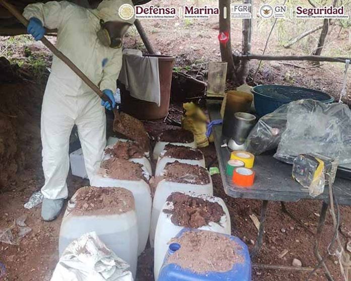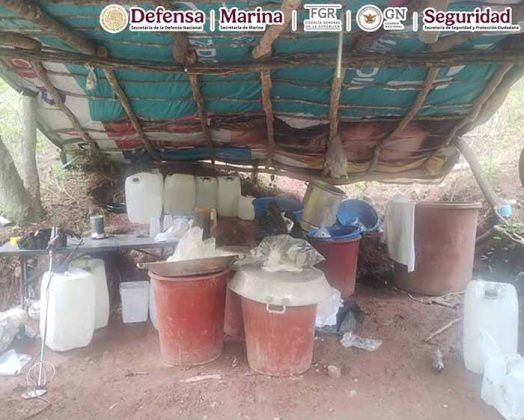 Resultado del reforzamiento de seguridad en el Estado de Sinaloa, elementos de la Secretaría de la Defensa Nacional (Defensa), en coordinación con Secretaría de Marina (Semar), Fiscalía General de la República (FGR), Guardia Nacional (GN) y Secretaría de Seguridad y Protección Ciudadana (SSPC) localizaron e inhabilitaron cuatro áreas de concentración de materiales para la fabricación de drogas sintéticas.