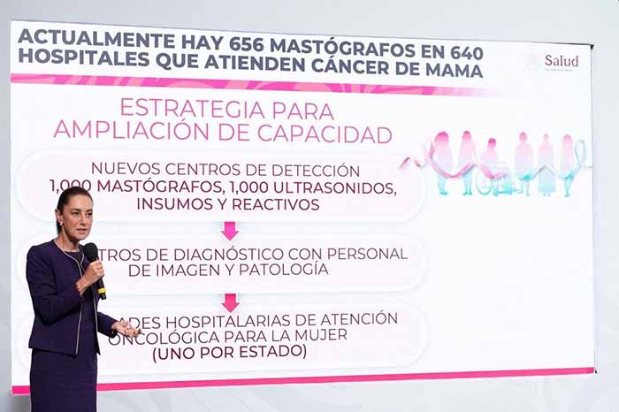 Ciudad de México, 21 de octubre de 2025.- La Presidenta Claudia Sheinbaum Pardo anunció una inversión de 8 mil millones de pesos (mdp) que se destinará al Modelo de Atención Universal de Cáncer de Mama, que marcará un antes y un después en la atención de esta enfermedad, que en México es la principal causa de muerte en mujeres, y para ello se adquirirán, entre 2026 y 2027, mil mastógrafos, mil ultrasonidos, —que se sumarán a los 656 mastógrafos que ya están en operación en 640 hospitales—, que estarán en los Nuevos Centros de Detección, además se aperturarán 20 Centros de Diagnóstico con personal de imagen y patología para la interpretación de los estudios y se construirán 32 Unidades Hospitalarias de Atención Oncológica para la mujeres, uno en cada estado.