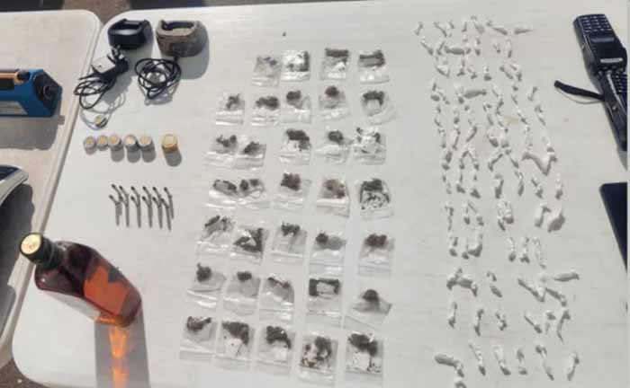 Culiacán, Sin.;16 de Diciembre.- En una tercera revisión sorpresiva, efectuada en menos de 24 horas en el penal de Culiacán, se aseguraron 128 dosis de diversas drogas, 46 nuevos teléfonos celulares, doce cartuchos calibre 22, dos radios, dos antenas de internet satelital (Starlink) y una botella de whisky, entre otros objetos prohibidos.