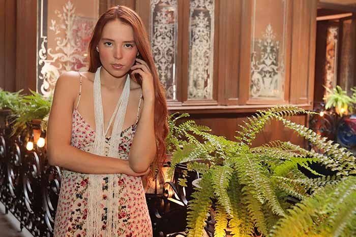 La cantante de regional mexicano lo utilizó en un evento nocturno, donde las luces de los reflectores hacían reavivar el vestido. En su caso ella no lleva ningún tipo de accesorio ya que es bastante llamativo por sí sola la prenda.